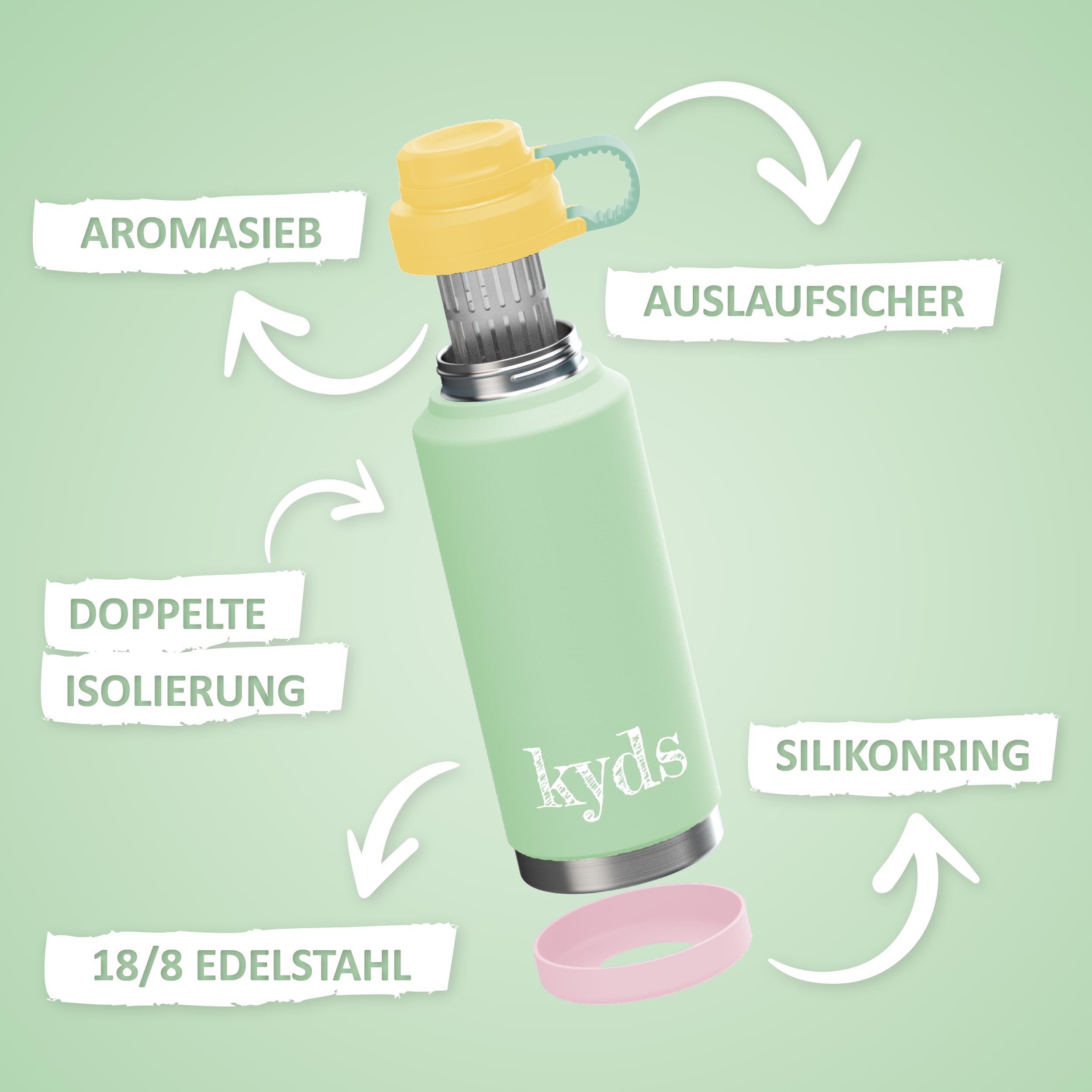 Die innovative Kinder-Isolierflasche von kyds: Hält Getränke lange warm oder kalt, ideal für Schule, Ausflüge und Abenteuer – robust, auslaufsicher und perfekt für kleine Hände!