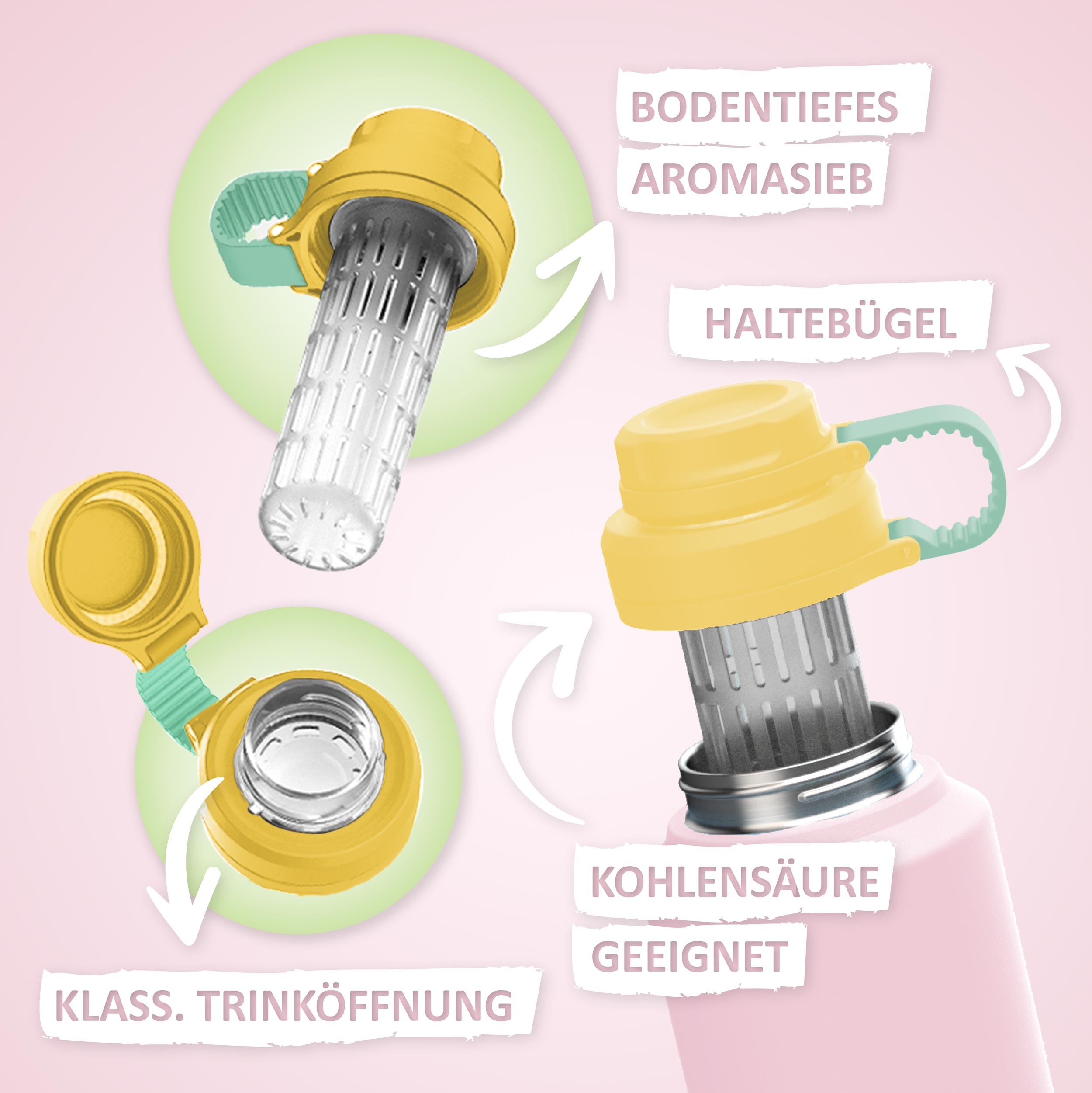 Unsere Isolierflasche für Kinder mit ihrem praktischem Aromasieb verwandelt Wasser in fruchtige Erfrischungen. Ein zusätzlicher drehbarer Deckel, inkl. integriertem Haltebügel hält den Trinkbereich sauber.